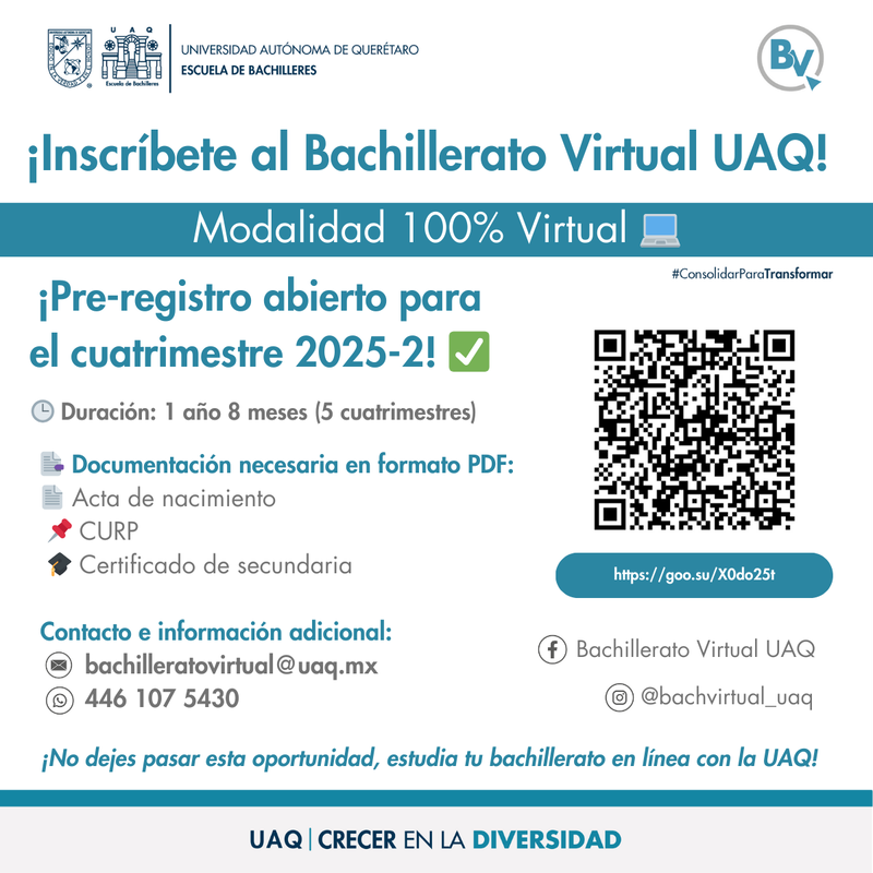 El Plan de Estudios 2022 del Bachillerato Virtual de la Escuela de Bachilleres de la Universidad Autónoma de Querétaro es de tipo propedéutico, general e intensivo, con un compromiso social. Su función es brindar una oferta educativa flexible, dirigida a todas las personas que deseen continuar con su formación de nivel medio superior a través de una metodología 100% virtual.